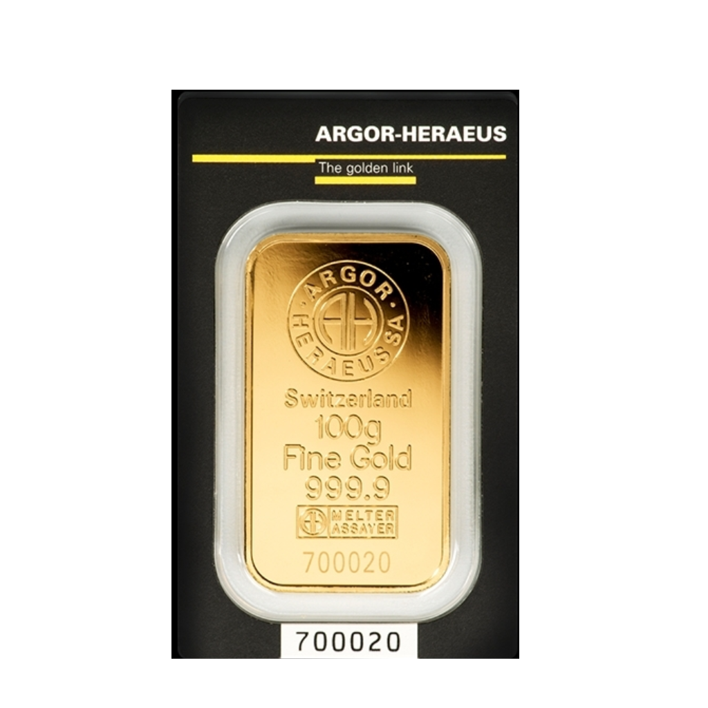 The Argor Heraeus 100 gram gold bar is made for investment purposes, from 999.9‰ (24 carat) gold. The product is manufactured by the world-renowned Swiss refinery Argor Heraeus, one of the leaders in the international precious metals market.