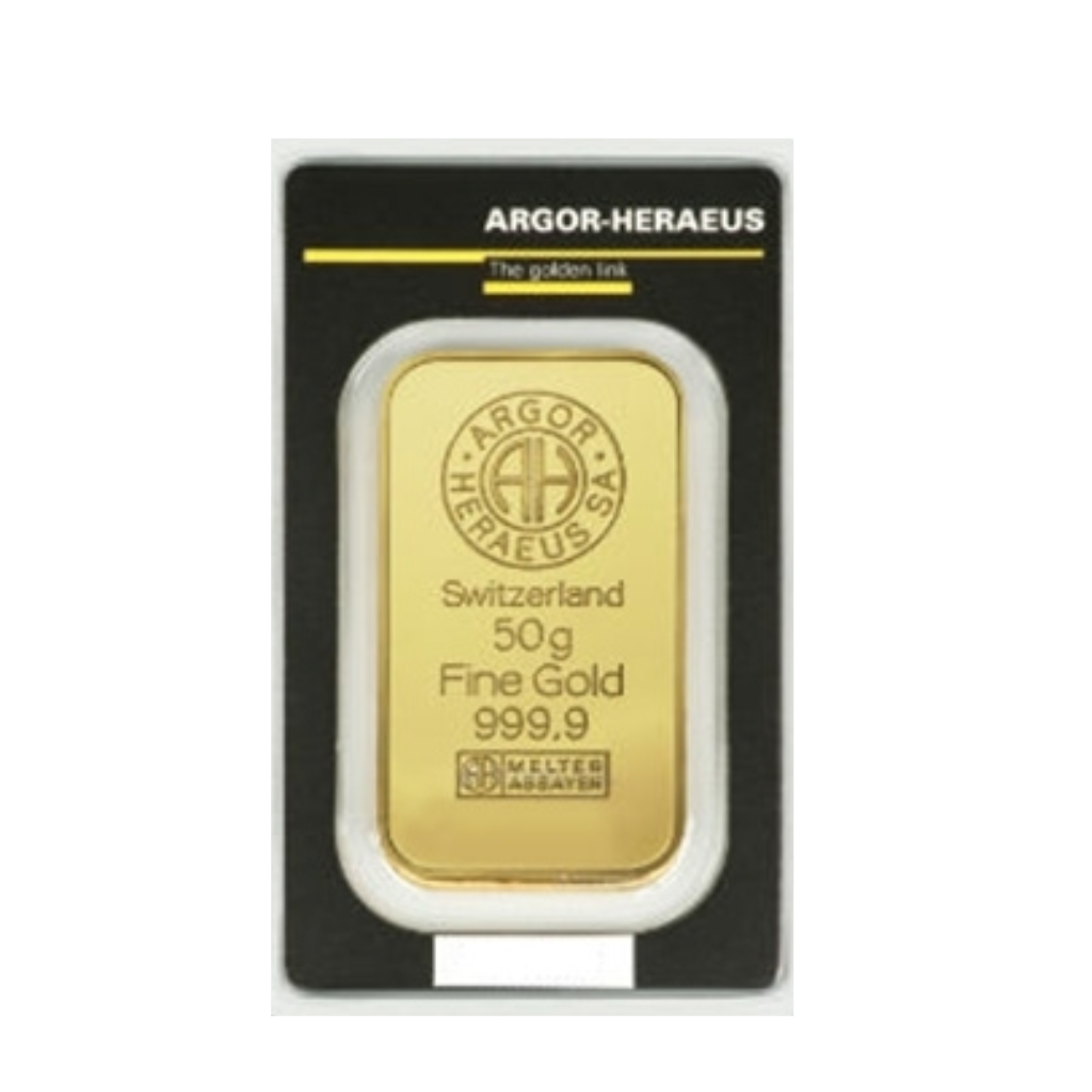 The Argor Heraeus 50 gram gold bar is 24 carat investment gold, 999.9‰ purity, made in Switzerland. It is made in an elegant pressed version, packaged in a safety blister and provided with a unique serial number, which guarantees authenticity. An ideal choice for investment or as a valuable gift.