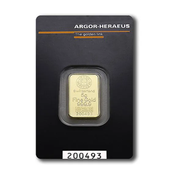 Lingoul de aur Argor Heraeus de 5 grame este realizat pentru investiții, din aur cu puritate 999.9‰ (24 de carate). Produsul este fabricat de rafinăria elvețiană Argor Heraeus, recunoscută la nivel mondial, unul dintre liderii pieței internaționale a metalelor prețioase.